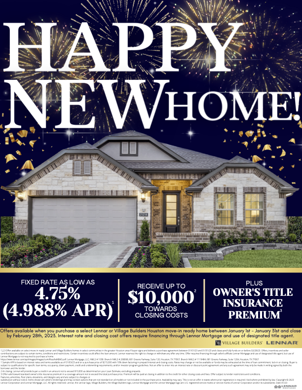 Lennar will be offering a fixed rate as low as 4.75% (4.988% APR), PLUS up to $10,000 towards closing costs, PLUS Owner's Title Insurance Premium. These offers are available when you purchase a select Lennar or Village Builders Houston move-in ready home between January 1st - January 31st and close by February 28th , 2023. Interest rate and closing cost offers require financing through Lennar Mortgage and use of designated title agent.